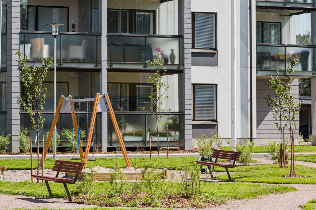 Yhteisiä tiloja talossa on runsaasti: saunaosasto, kuivaushuone ja hyvät varastotilat. Piha-alueella on viihtyisä leikki- ja oleskelualue ja autopaikat.
