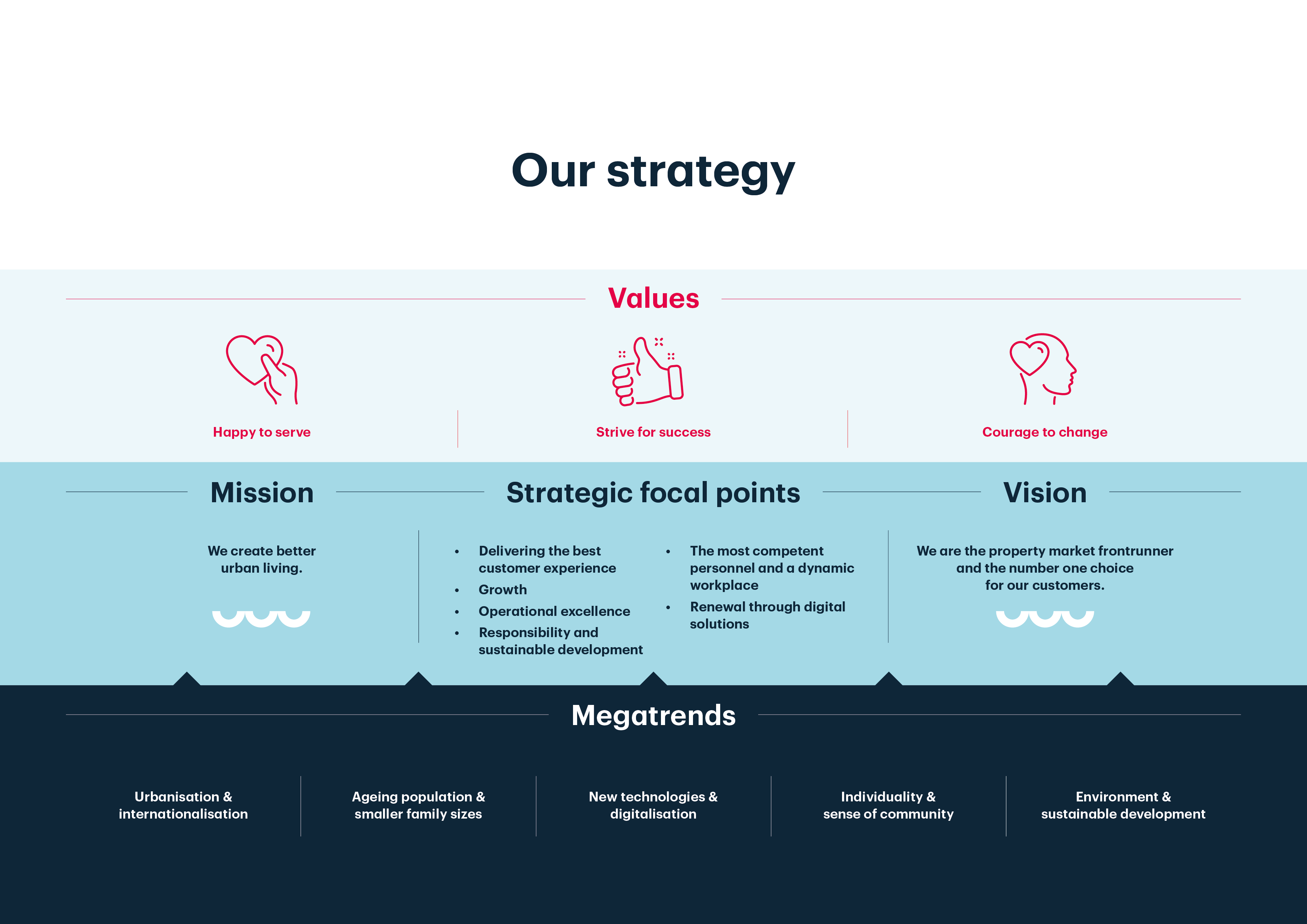 For our customers, we offer popular car-sharing services and extensive opportunities for recycling, among other things. We will continue to invest in responsible and innovative operating principles and transparent reporting. It is a priority for us to ensure our future competitiveness through competence development and to deliver an employee experience that attracts the best talent in the industry.