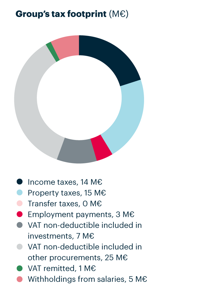 As a significant taxpayer, we participate in the development of society. All of our operations take place in Finland and we pay all of our taxes to Finland. Our tax footprint specifies all of the taxes and tax-like charges that society collects based on our operations. They include the direct and indirect taxes we pay as well as withholding taxes on the wages of our employees.