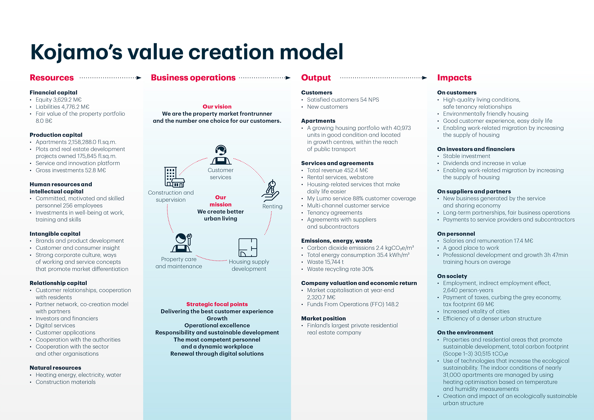 Kojamo’s key strengths include Lumo rental apartments with good transport connections and services, service business development, systematic real estate development, good investment opportunities, and skilled personnel.