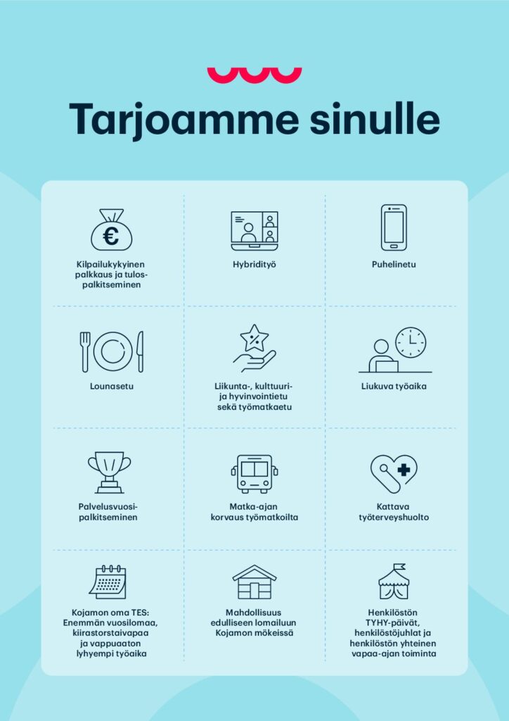 Pidämme kojamolaisten hyvinvoinnista huolta. Tarjoamme laajat työterveyspalvelut, virkistys- ja vapaa-ajantoimintaa sekä lounas-, liikunta-, kulttuuri- ja hyvinvointiedun.