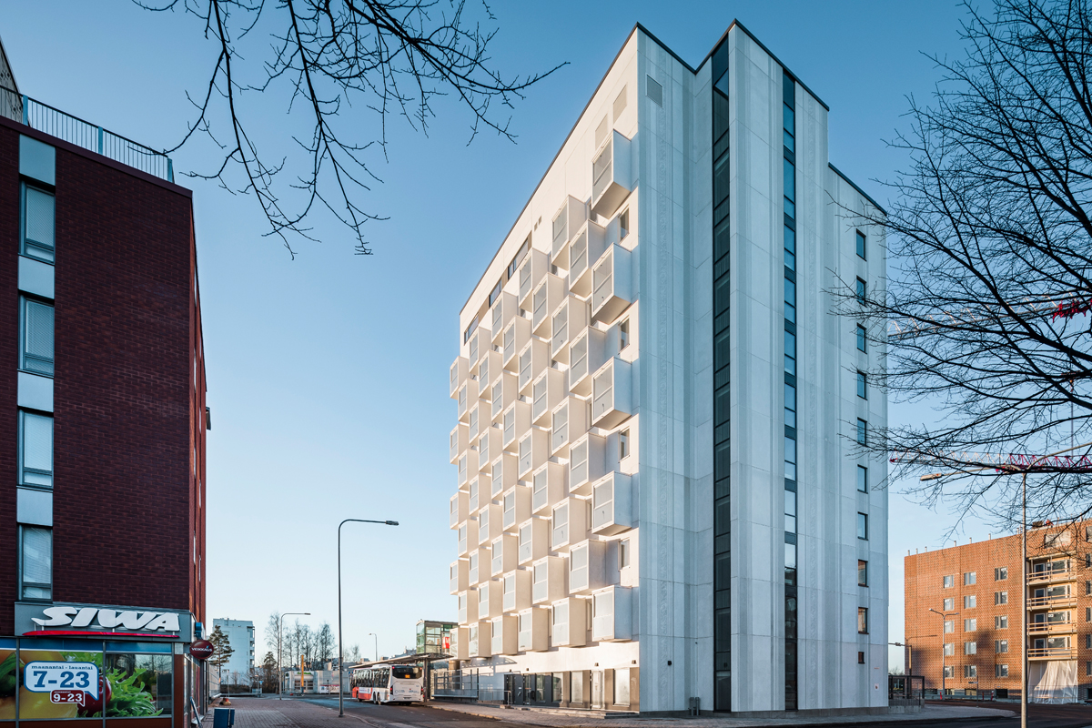 Asuintalon ulkoseinien pinnat ovat valkobetonia, graafista raidoitettua betonia sekä maalattua pintaa. Katujulkisivujen noppaparvekkeet elävöittävät maisemaa ja erilaiset pintastruktuurit on suunniteltu heijastamaan valoa ja varjoja kiinnostavalla tavalla.
