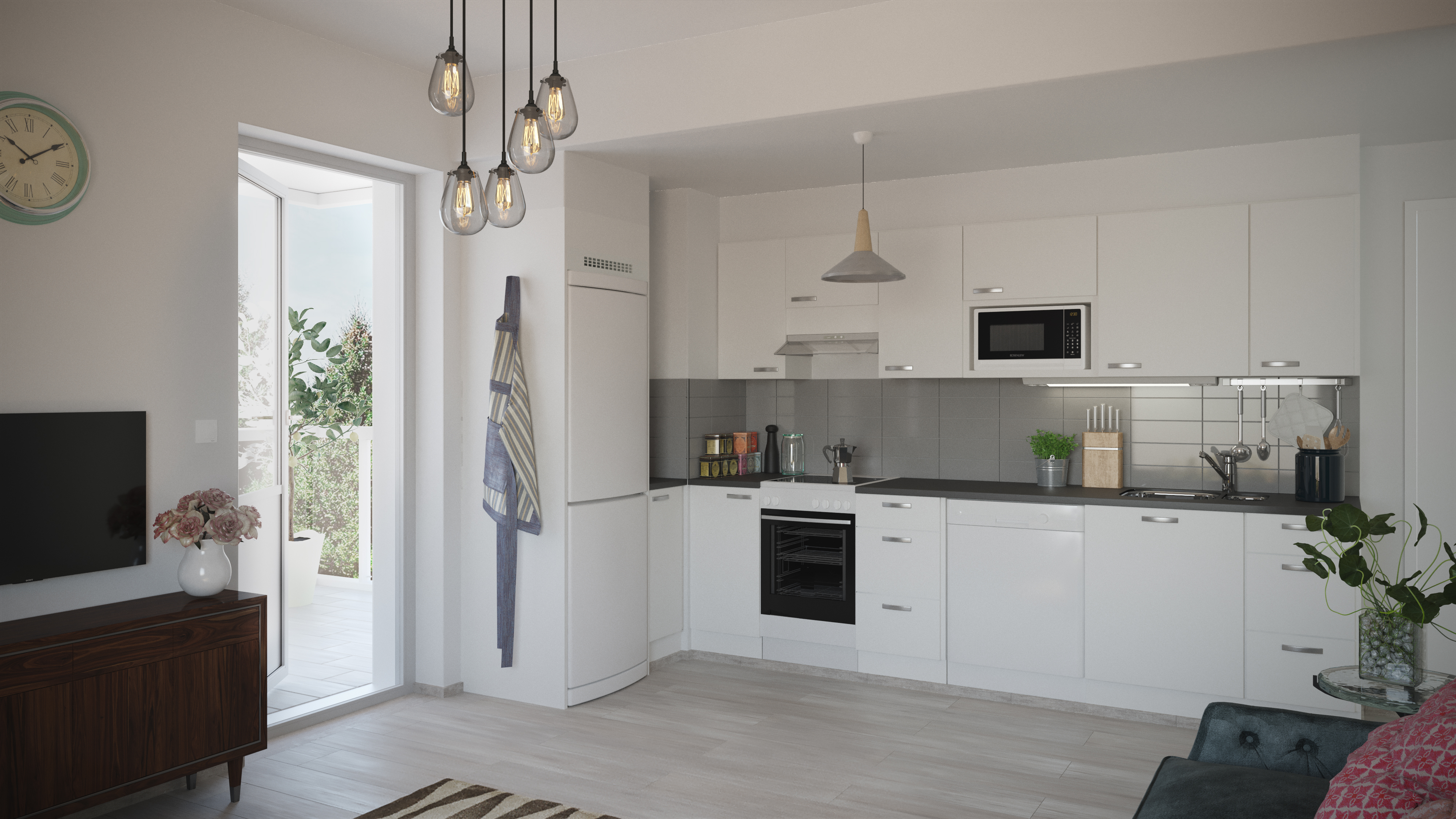 Valoisien ja vaaleasävyisten asuntojen ja lattiat ovat harmaansävyistä laminaattia ja seinät ovat valkoiset. Keittiöissä on muun muassa astianpesukone ja keraaminen liesi. Tilavat kylpyhuoneet on laatoitettu ja niissä on lattialämmitys.