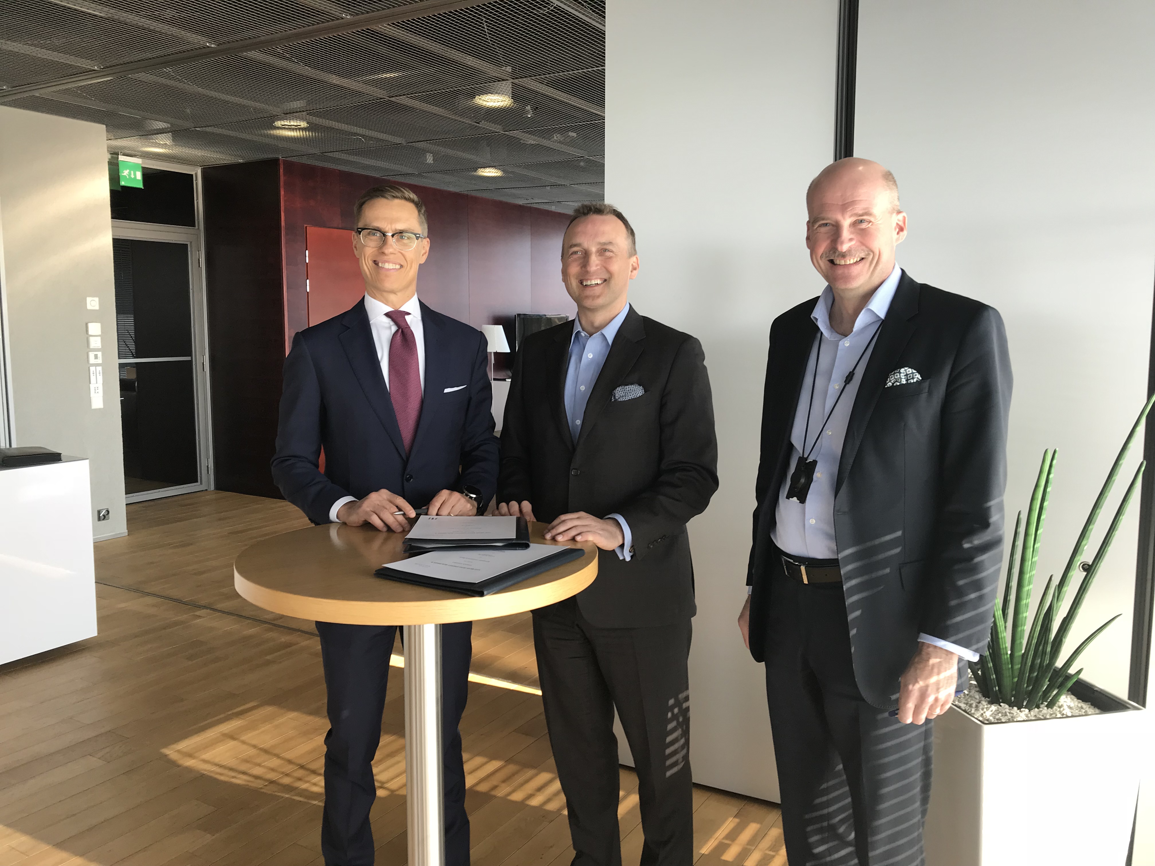 Kuvassa vasemmalta: EIP:n varapääjohtaja Alexander Stubb, Kojamon toimitusjohtaja Jani Nieminen ja talousjohtaja Erik Hjelt lainasopimuksen allekirjoitustilaisuudessa 7.3.2018.