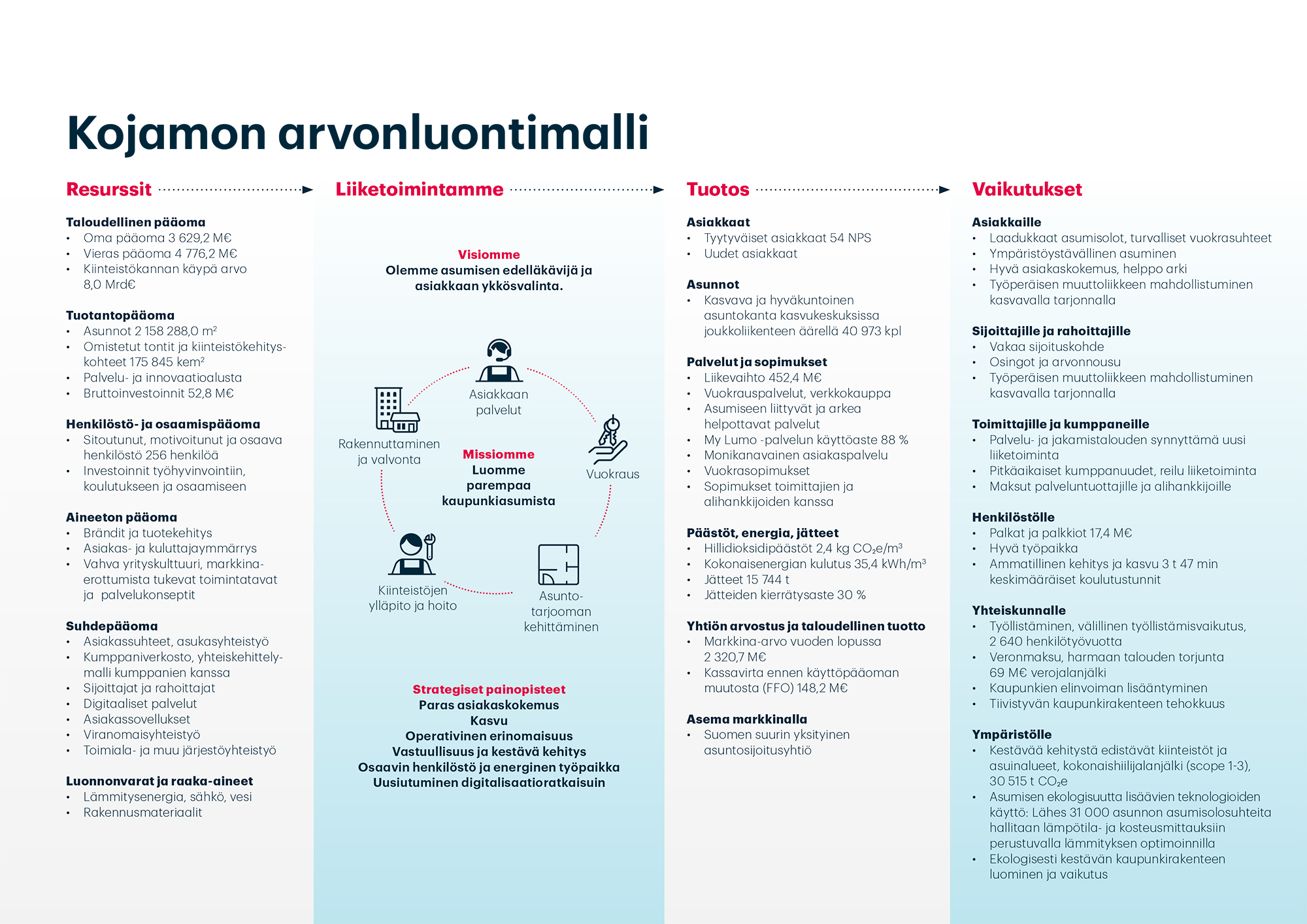 Tuotamme omistamillamme vuokra-asunnoilla ja asumisen palveluilla sekä aktiivisella asuntotarjooman kehittämisellä arvoa asiakkaille, omistajille sekä muille sidosryhmille ja ympäröivälle yhteiskunnalle. Omistaja-arvon pitkäjänteinen kehittäminen luo perustan taloudelliselle vastuulle.