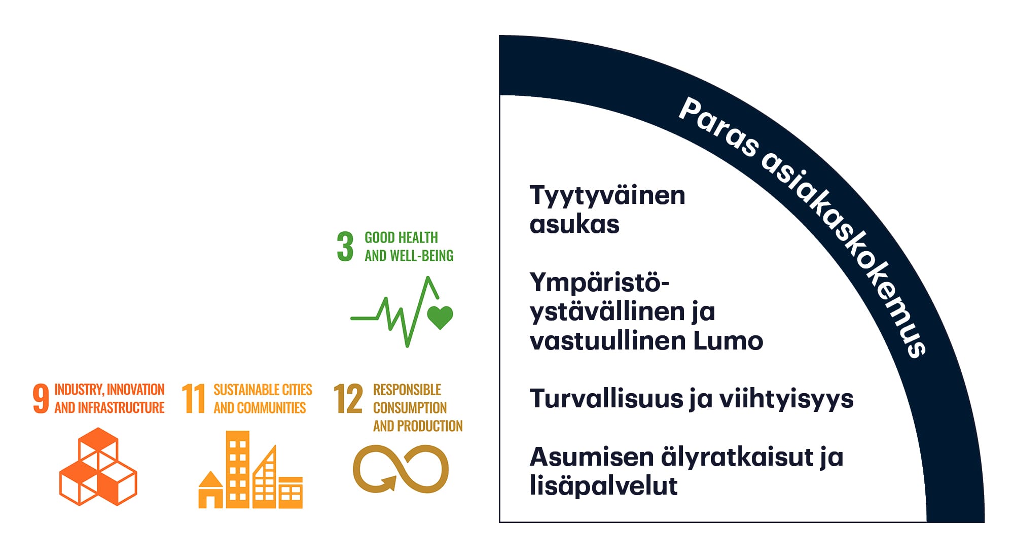 Työskentelemme vastuullisemman ja paremman kaupunkiasumisen puolesta. Lumo-brändi tarjoaa asukkaillemme parhaan asumisen asiakaskokemuksen. Päätavoitteinamme ovat tyytyväinen asukas ja suositteluhalukkuuden (NPS) kasvattaminen.