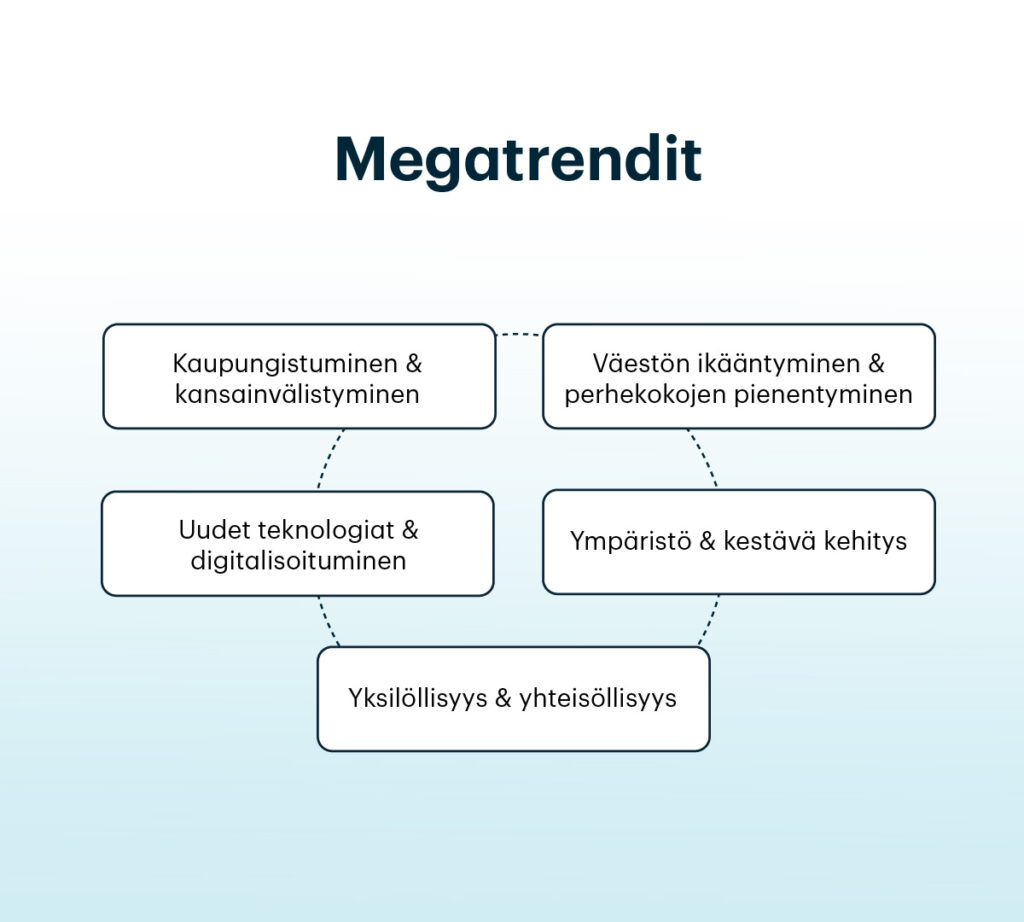 Kojamo vastaa strategiansa mukaan kaupungistumisen, digitalisoitumisen sekä yhteisöllisyyden trendeihin ja tarjoaa vuokra-asuntoja ja asumiseen liittyviä palveluita Suomen suurimmissa kasvukeskuksissa.